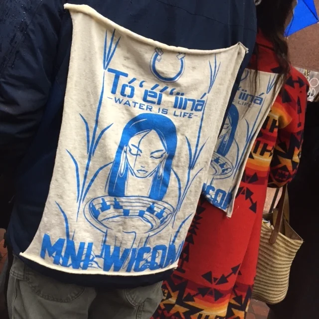 (100f. "We begin our first chant, 'Mni Wiconi, water is life.' WW look confused. WW staring at us or just acting oblivious like we weren't there.")